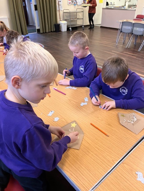 The class was divided into two groups to make the most of the activities. While one group explored the Christmas story through the immersive journey, the other created envelope nativity scenes, carefully colouring in the characters. After enjoying juice and biscuits, the groups swapped activities.