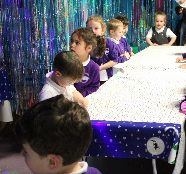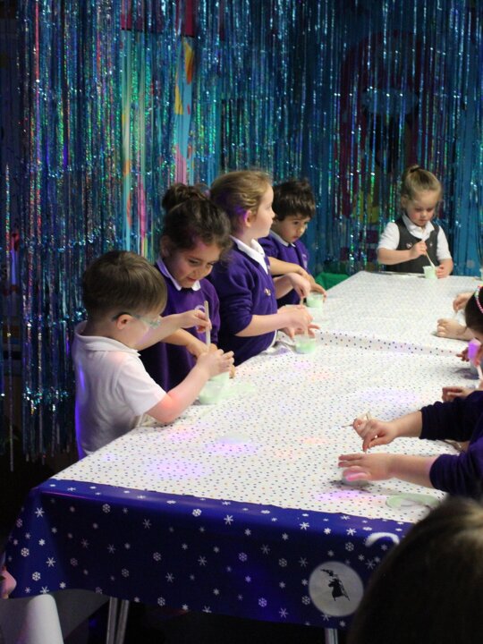 The children took part in a science workshop where they made slime and snow, learning how materials can change when mixed together. The workshop also included a rapping elf who made smoke bubbles. The children created their own magnet decorations to take home, showing great creativity and concentration.