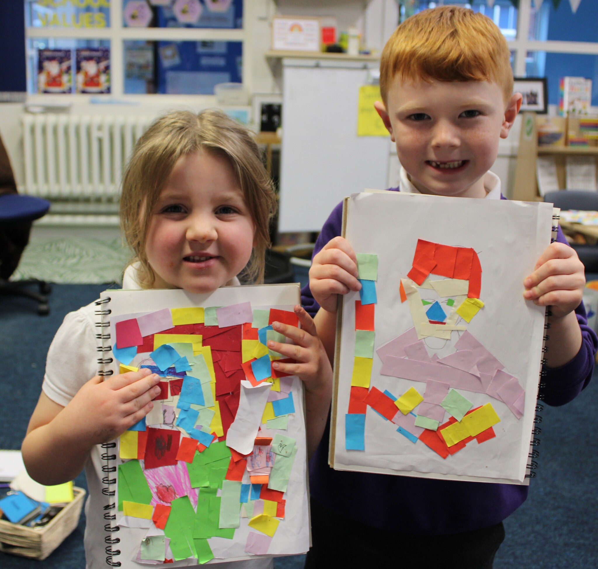 Using their knowledge of line, the children carefully observed their facial features and explored the different shapes they could see in their own faces. After drawing their portraits, they added bright, colourful pieces of paper in a variety of shapes and sizes to produce vibrant collage versions of themselves.