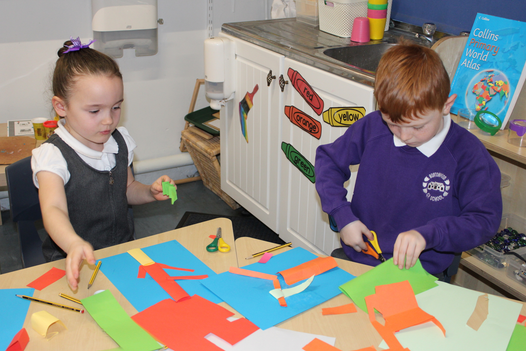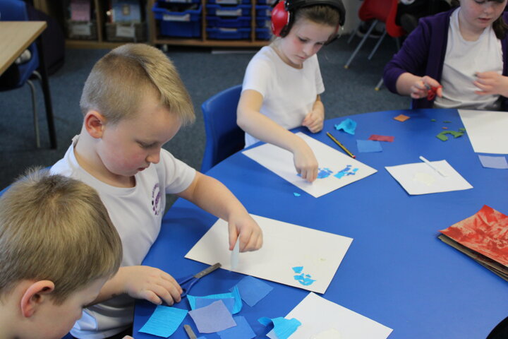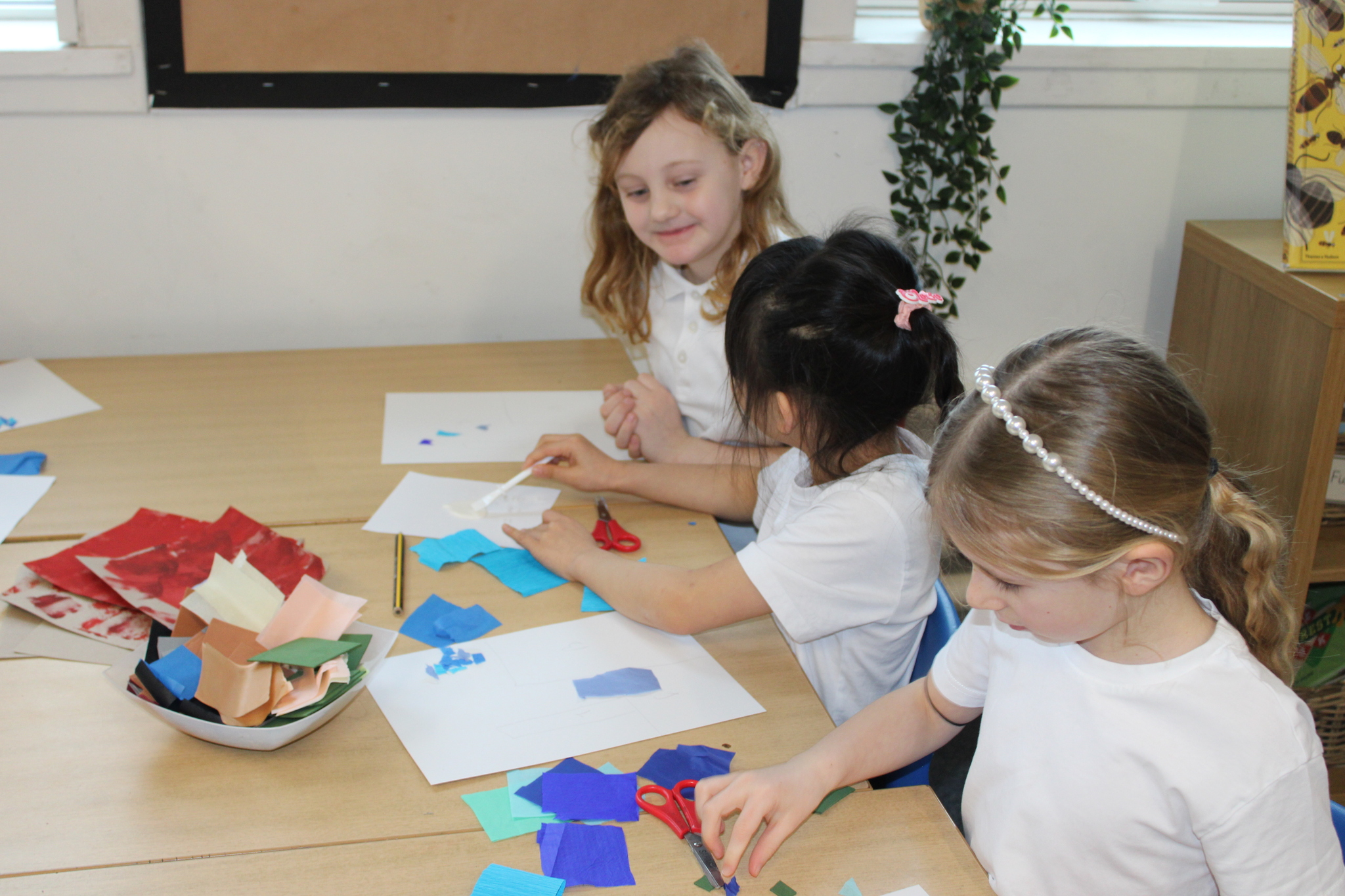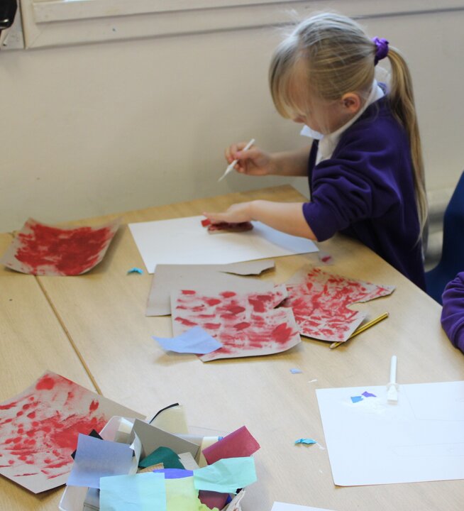 In Year 2, pupils focused on collage, creating wartime scene artwork using a range of materials and colours. Children were encouraged to tear and layer small pieces carefully, allowing them to create subtle changes in shade and texture. This approach helped pupils understand how artists can use colour and material choices to create atmosphere and depth within an image.