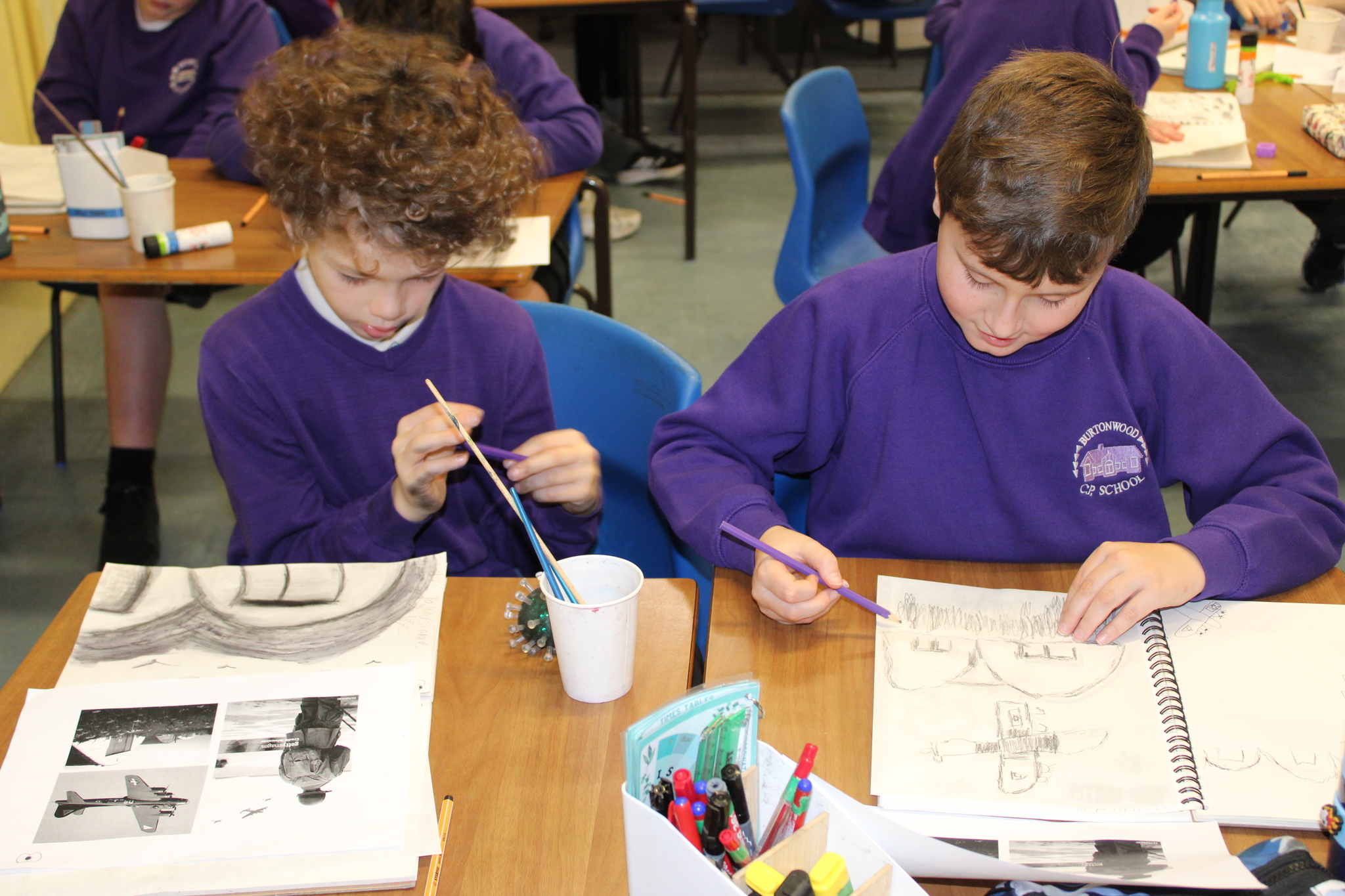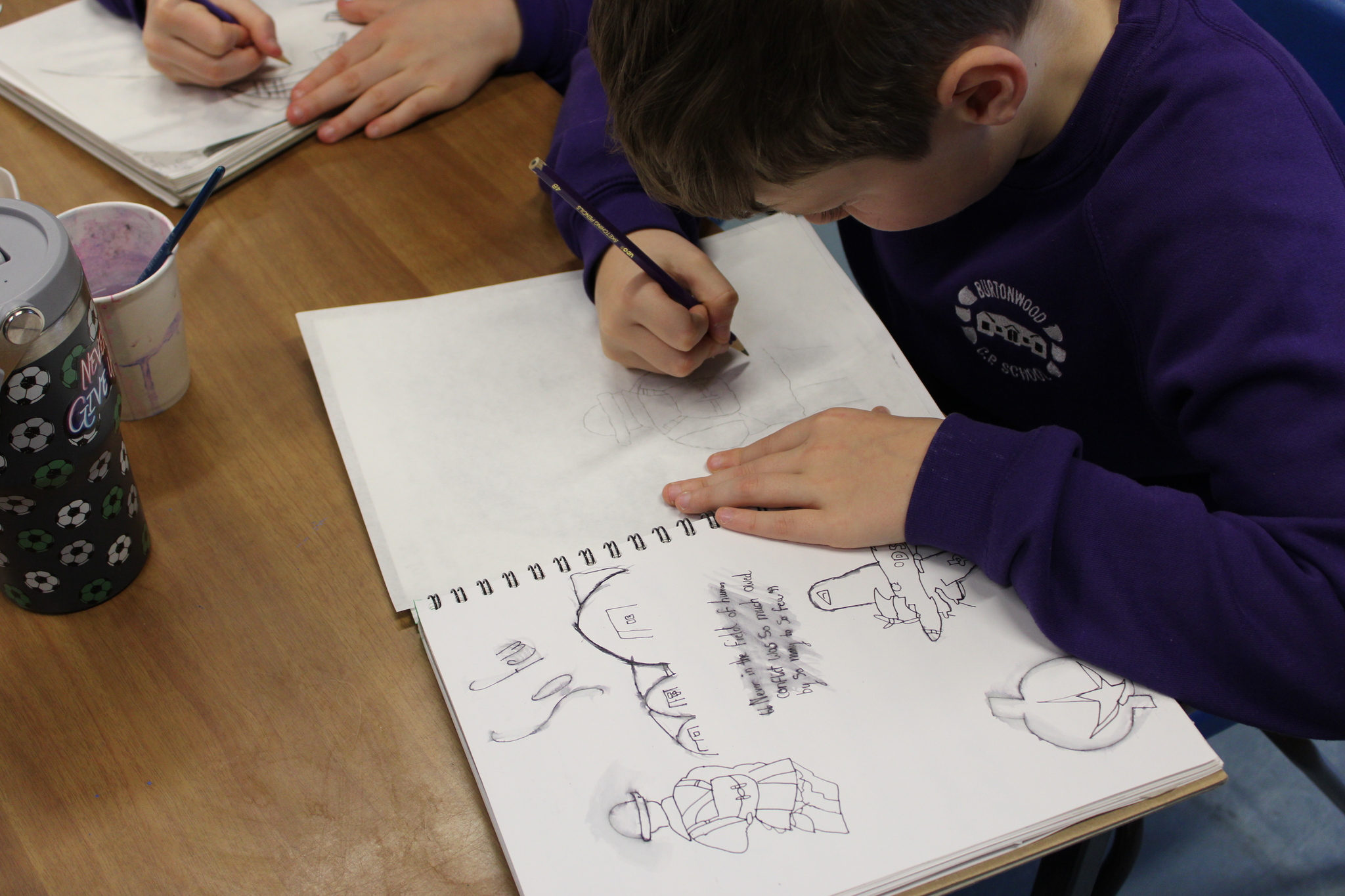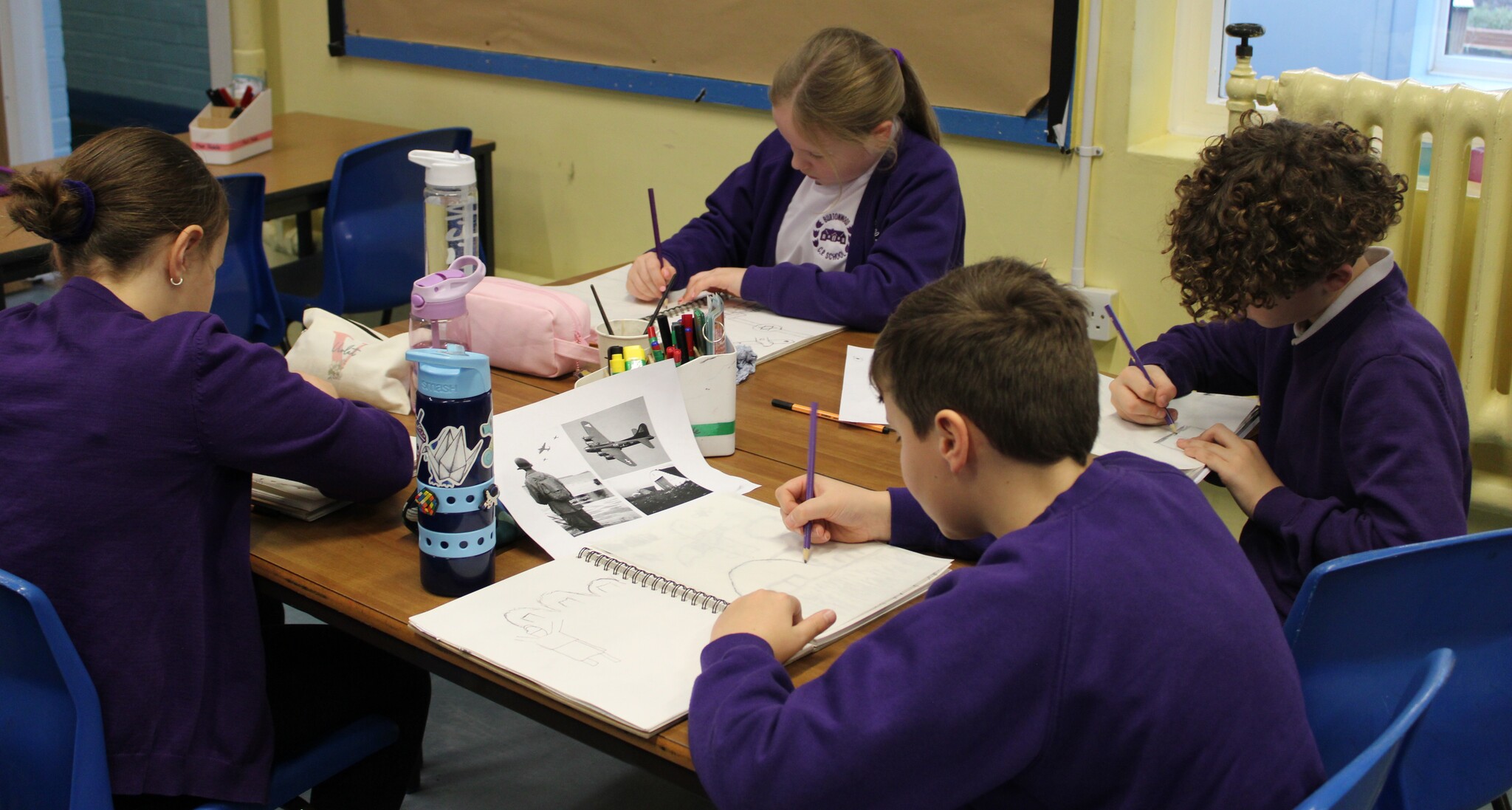 Year 5 pupils focused on artwork inspired by the history of Burtonwood Airbase. Through research and exploration, children developed bold and thoughtful pieces using printing and drawing techniques. Their work demonstrated careful attention to detail and a strong understanding of how art can be used to communicate ideas linked to local history.